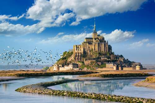 【聖米歇爾山】一座潮起潮落的神秘外海孤島;它被 19 世紀法國大文豪雨果封稱為「海上金字塔」,也在1979年被聯合國教科文組織列為世界文化遺產(UNESCO)。早在8世紀之前,聖米歇爾山周邊並非是今日所見的沙洲,而是一片青翠的「西希」森林,但因不知名的原因使森林沈入陸地,所以造就這座周長900公尺、高88公尺的花岡岩小山孤立於沙洲。這座位於英吉利海峽、法國北部諾曼第及布列塔尼半島間交界處外海附近的岩石島嶼和奇偉建築,距離海岸約一公里,從中古世紀以來就是宗教與建築的奇觀,也是數百年來天主教信徒的朝聖地。
