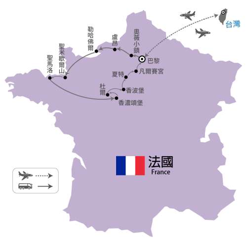 【行車距離】聖馬洛- 50km -聖米榭爾山- 325km -香濃頌堡- 30km -杜爾