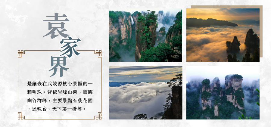 【袁家界-電梯上(下車參觀)】位於砂刀溝北麓,是武陵源又一風景集中之地。後花園有《天然盆景》之稱,園內石峰千姿百態,溪水繞峰而流,山上古木參天,雲霧瀰漫,猶如古時皇宮內的後花園一樣。