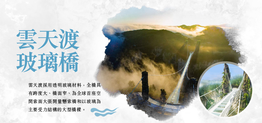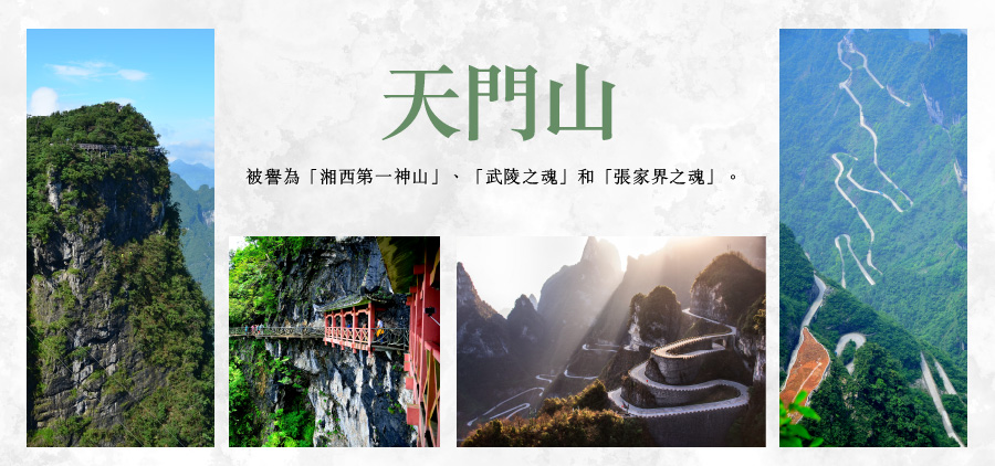 【天門山含纜車上或下(下車參觀)】是目前世界上最長的單線循環式高山客運索道,長7454米,高差1277米;天門洞氣勢臨空獨尊,世界上最高海拔的天然穿山溶洞,門高131公尺、寬57公尺、深 60公尺;1999年世界特技飛行大師曾架機穿越天門洞,引起世人關注。