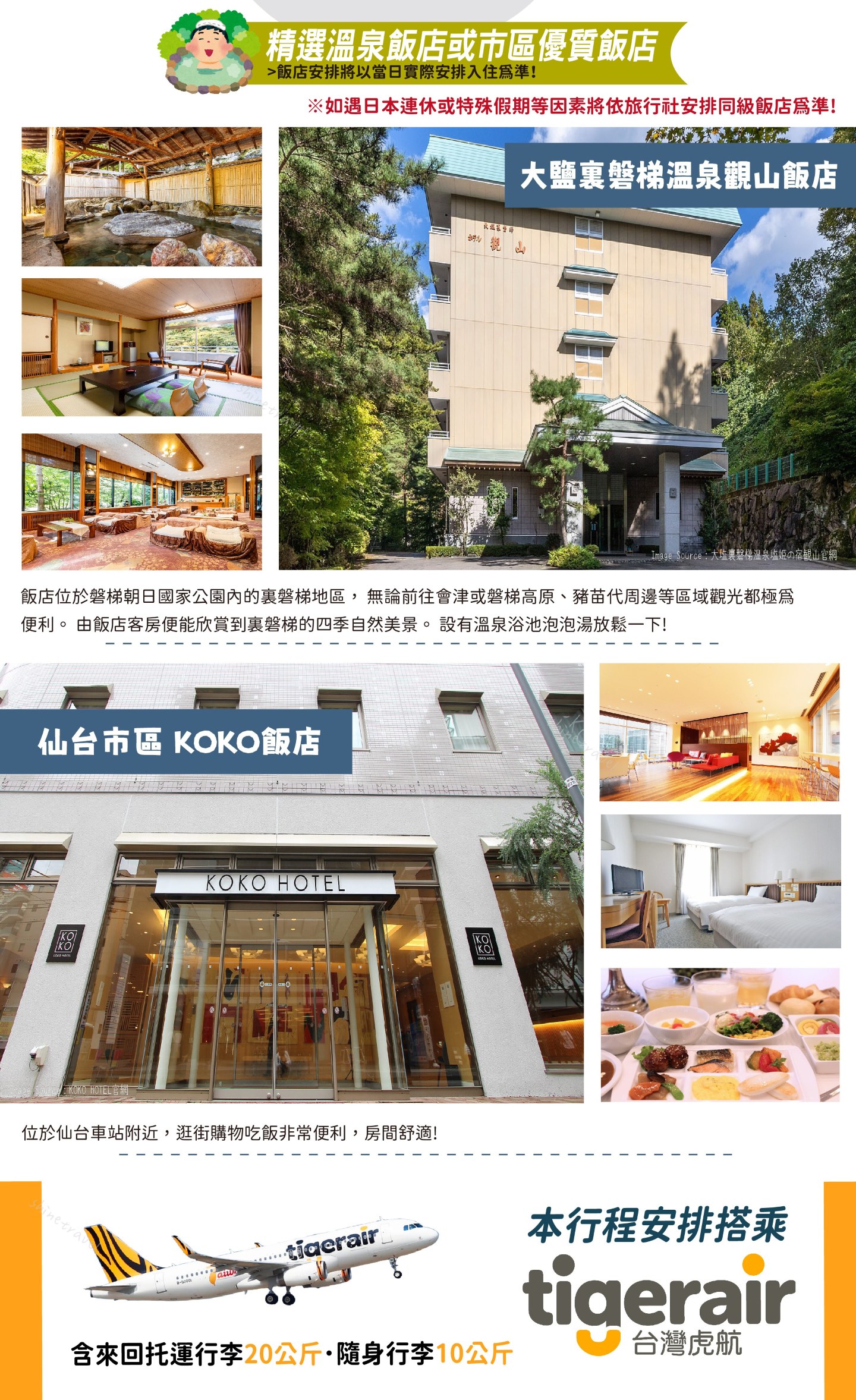 住宿:仙台APA飯店 或仙台KOKO HOTEL或仙台Route INN飯店 或仙台Comfort飯店 或 福島Comfort飯店 或福島Route INN飯店 或福島Richmond飯店 或同等級