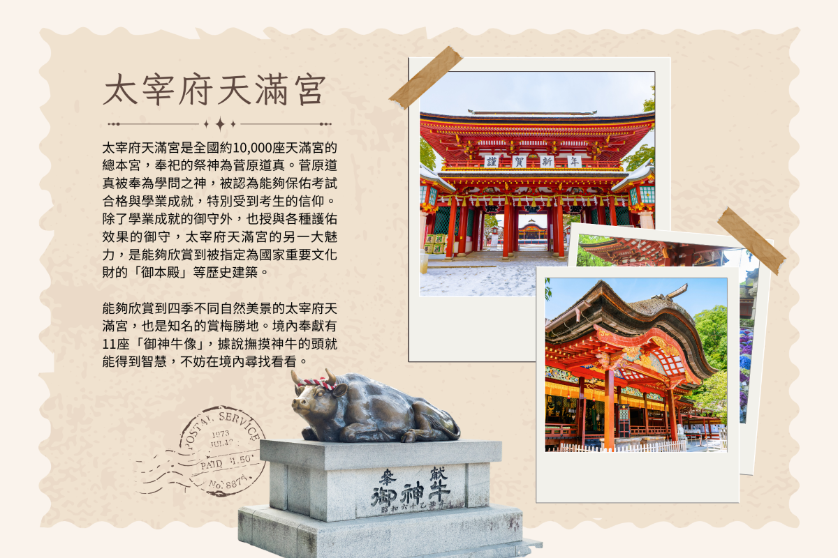 【太宰府天滿宮】太宰府天滿宮是全國約10,000座天滿宮的總本宮,奉祀的祭神為菅原道真。菅原道真被奉為學問之神,被認為能夠保佑考試合格與學業成就,特別受到考生的信仰。除了學業成就的御守外,也授與各種護佑效果的御守,太宰府天滿宮的另一大魅力,是能夠欣賞到被指定為國家重要文化財的「御本殿」等歷史建築。能夠欣賞到四季不同自然美景的太宰府天滿宮,也是知名的賞梅勝地。境內奉獻有11座「御神牛像」,據說撫摸神牛的頭就能得到智慧,不妨在境內尋找看看。