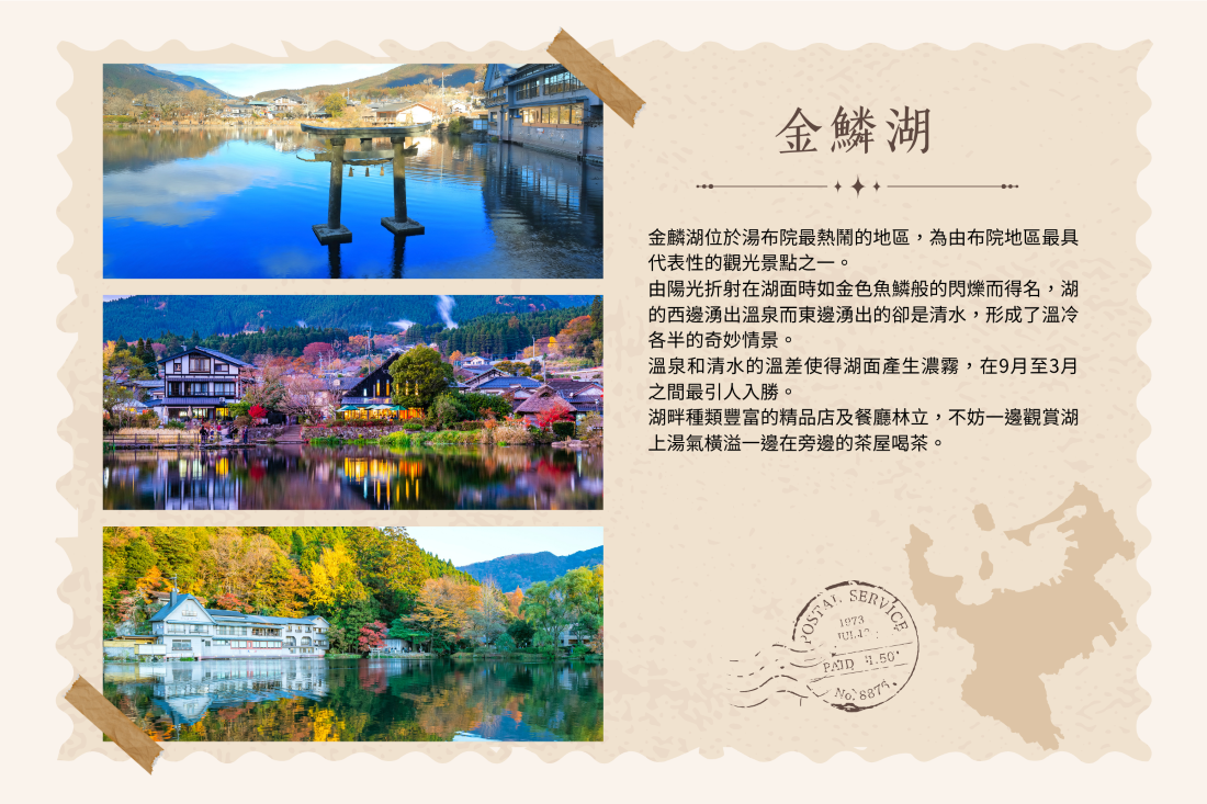 【金鱗湖】金鱗湖(きんりんこ)是一座小巧卻極具魅力的湖泊。湖名來自一位儒學者「毛利空桑」的命名,據說湖中魚群在夕陽下魚鱗閃閃發光,如金色鱗片,故稱「金鱗湖」。湖水由冷泉與溫泉混合而成,因此即使冬日清晨,湖面也常常升起如仙境般的霧氣,吸引無數旅人與攝影愛好者前來朝聖