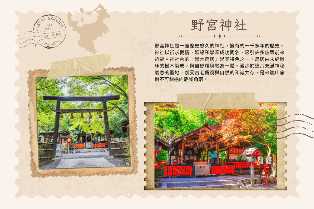 【野宮神社】野宮神社是一座歷史悠久的神社,擁有約一千多年的歷史。神社以祈求愛情、姻緣和學業成功聞名,吸引許多信眾前來祈福。神社內的「黑木鳥居」是其特色之一,鳥居由未經雕琢的樹木製成,與自然環境融為一體。漫步於這片充滿神秘氣息的聖地,感受古老傳說與自然的和諧共存,是來嵐山旅遊不可錯過的靜謐角落。