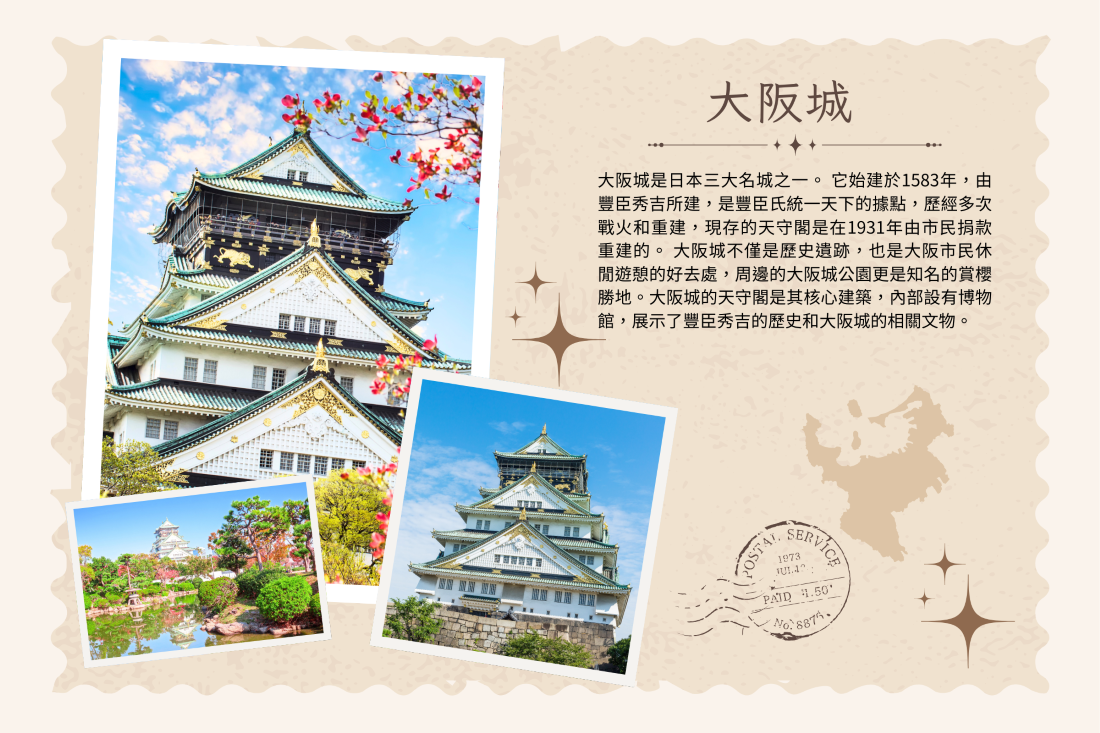 【大阪城】大阪城是日本三大名城之一。 它始建於1583年,由豐臣秀吉所建,是豐臣氏統一天下的據點,歷經多次戰火和重建,現存的天守閣是在1931年由市民捐款重建的。 大阪城不僅是歷史遺跡,也是大阪市民休閒遊憩的好去處,周邊的大阪城公園更是知名的賞櫻勝地。大阪城的天守閣是其核心建築,內部設有博物館,展示了豐臣秀吉的歷史和大阪城的相關文物。