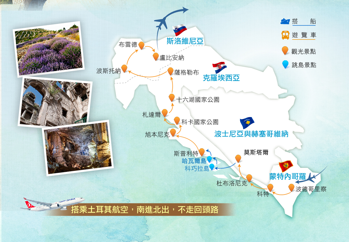 帶著愉悅的心情飛往亞得里雅海的仙境國度-克羅埃西亞、斯洛維尼亞、波士尼亞與赫塞哥維納、黑山共和國【蒙特內哥羅】,一起探索神祕色彩的異國風光,共創美好的回憶。班機於當日抵達後,專車將帶領我們前往飯店稍作休息,為隔日展開的穿越山海與時光的夢幻旅程——【亞得里亞海璀璨之旅 12 日】做好完美準備。