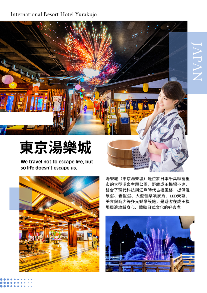【東京湯樂城】位於距離成田機場不遠的富里市,是CHI所屬的一座大型溫泉設施,總占地面積約20000㎡,歷時13個月建築完成,耗資24億日幣打造,連日本人都吃驚的大型溫泉,堪稱是溫泉的主題樂園。以明治時代的全盛時期為構想,裡面有餐廳、商店、神社…把明治的華美街景全都複製過來,規模之大,奢華至極。還有話題性十足的華麗聲光水舞秀以及天花板上的七彩投影,浮誇程度連日本人看了都好吃驚。