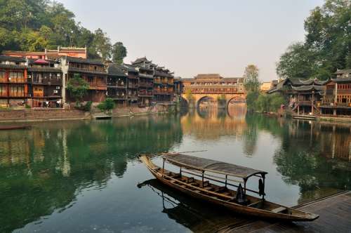 【鳳凰古城】始建於清康熙四十三年〔1704年〕,歷經300多年古貌猶存。現東門和北門古城樓尚在。城內青石板街道,江邊木結構吊腳樓,以及朝陽宮、古城博物館、楊家祠堂、沈從文故居、熊希齡故居、天王廟、大成殿、萬壽宮等建築,無不具有古城特色。鳳凰古城以回龍閣古街為中軸,連接無數的石板小巷,溝通全城。