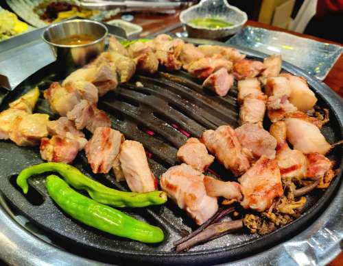 韓式烤肉,是韓國人民最愛的一種美食之一,有傳統烤肉方式,常用鐵板、銅板、銅鍋等食器及現在的鐵網直火烤肉等各式方法,再佐以醃漬醬料食用,唯不變的就是來韓國玩一定是不容錯過的美食。(圖為示意食材以現場提供為主)