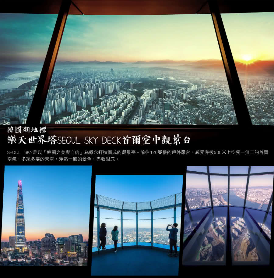 高555公尺,123層樓的樂天世界塔,融合韓國傳統之美、人類、技術、科技與自然。建築內不僅擁有韓國最高的觀景台「SEOUL SKY」、六星級SIGNIEL SEOUL飯店,還有附屬設施空間「PODIUM」,入駐了高級醫療中心、健身房、金融中心等,可說是一個多元化的垂直城市。118樓高的SKY DECK是「世界上最高的透明地板觀景臺」,而分速高達600公尺的天空電梯,則保有「世界最長輸送距離」與「世界最快雙層電梯」兩個紀錄。登上觀景臺不僅能將整個首爾盡收眼底,天氣好時還可遠眺仁川松島與西海岸。到首爾旅遊想登高俯瞰市景,除了南山塔,不妨可以考慮造訪SEOUL SKY,一睹韓國第一高樓的風采。