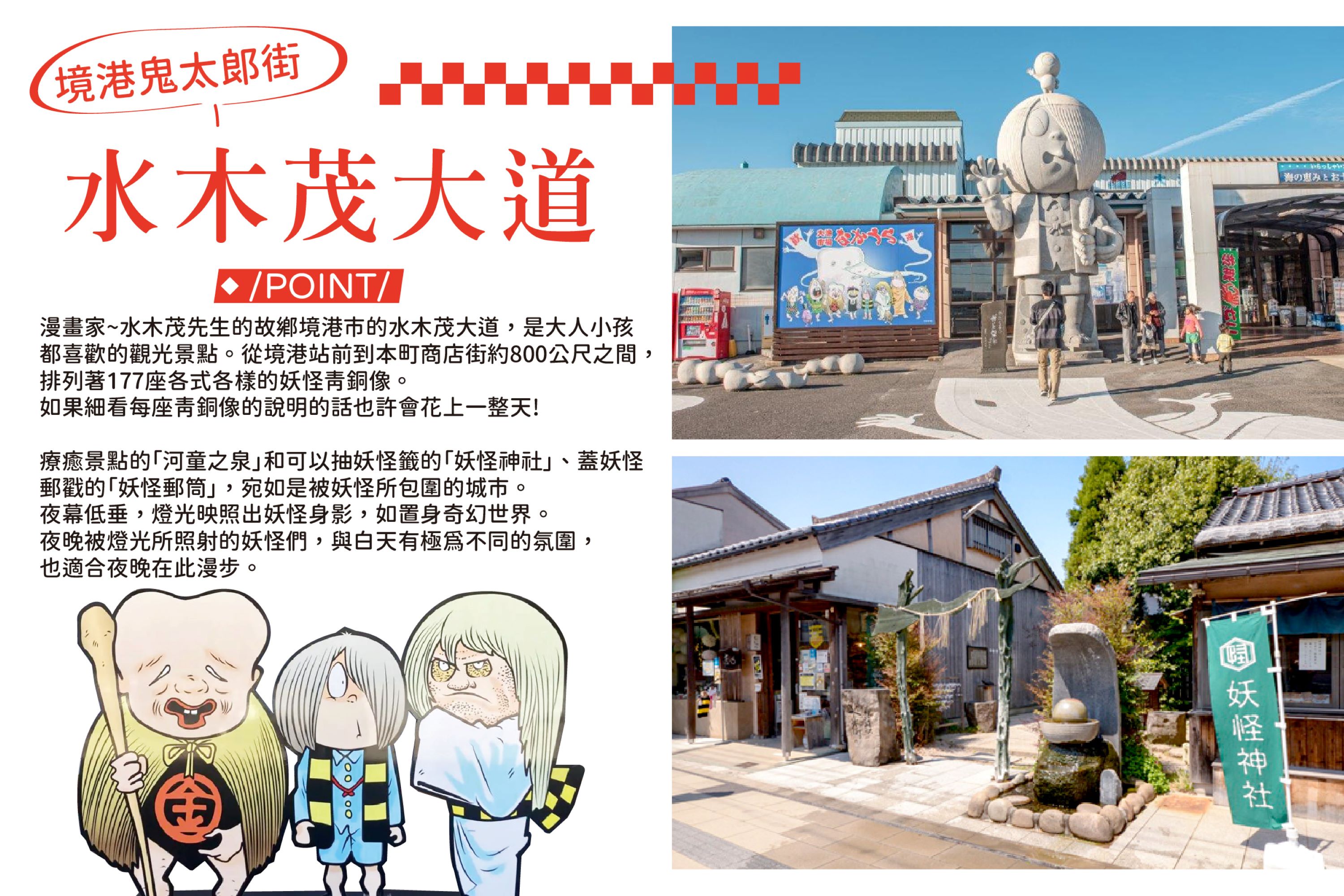 【境港鬼太郎街~水木茂大道】漫畫家・水木茂先生的故鄉境港市的水木茂大道,是大人小孩都喜歡的觀光景點。水木茂大道是從境港站前到本町商店街約800公尺之間,排列著177座各式各樣的妖怪青銅像。如果細看每座青銅像的說明的話也許會花上一整天! 療癒景點的「河童之泉」和可以抽妖怪籤的「妖怪神社」、蓋妖怪郵戳的「妖怪郵筒」,宛如是被妖怪所包圍的城市。夜幕低垂,燈光映照出妖怪身影,彷如置身奇幻世界。夜晚被燈光所照射的妖怪們,與白天有極為不同的氛圍,也適合夜晚在此漫步。