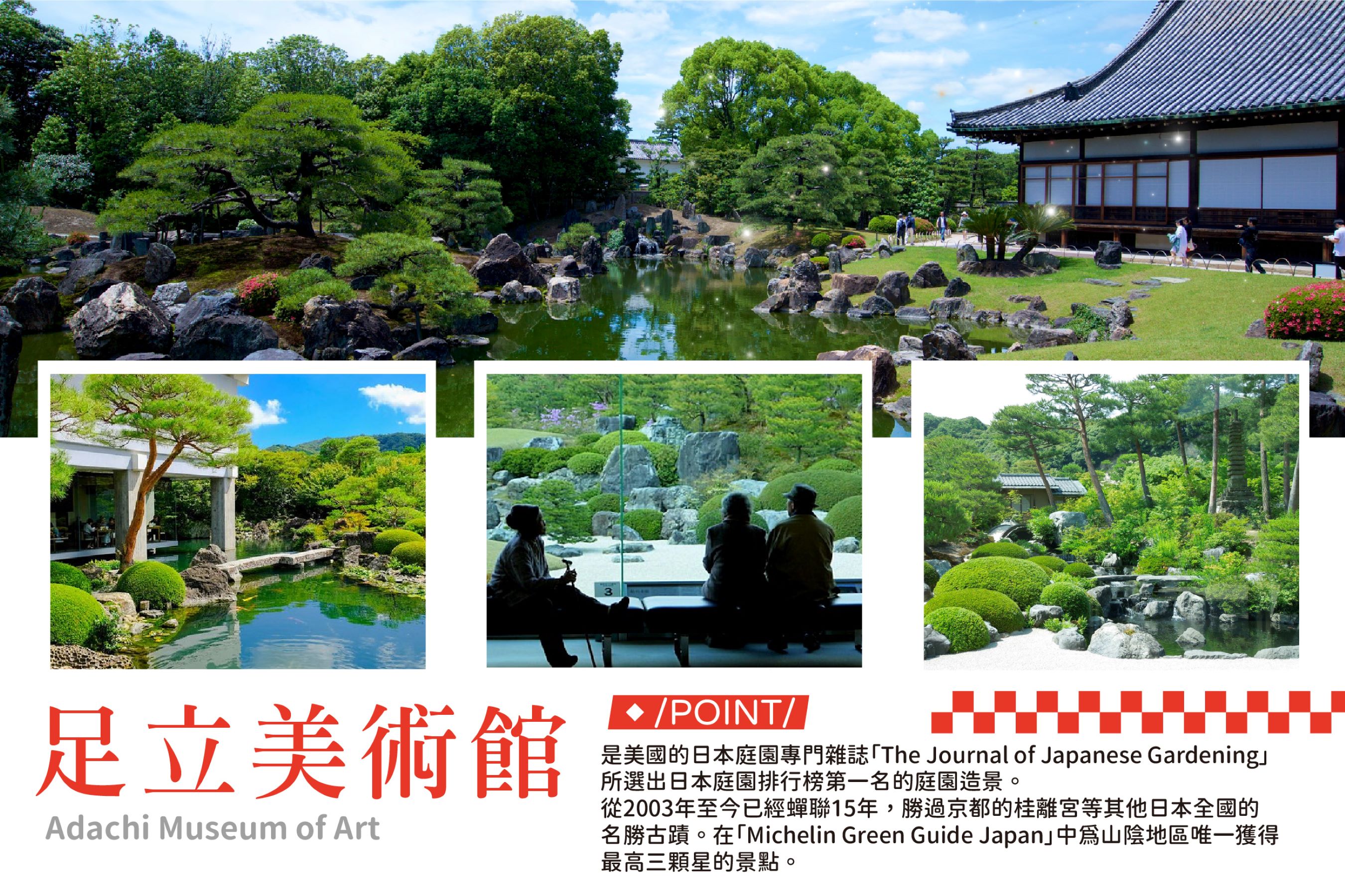 爾後專車前往【足立美術館】。由意境悠長的枯山水,飛瀑清泉、小橋流水、白沙青松組成的美麗庭園,將戶外景觀妝點得宛如一幅經典名畫,可謂是「景中有畫,畫中有景」。