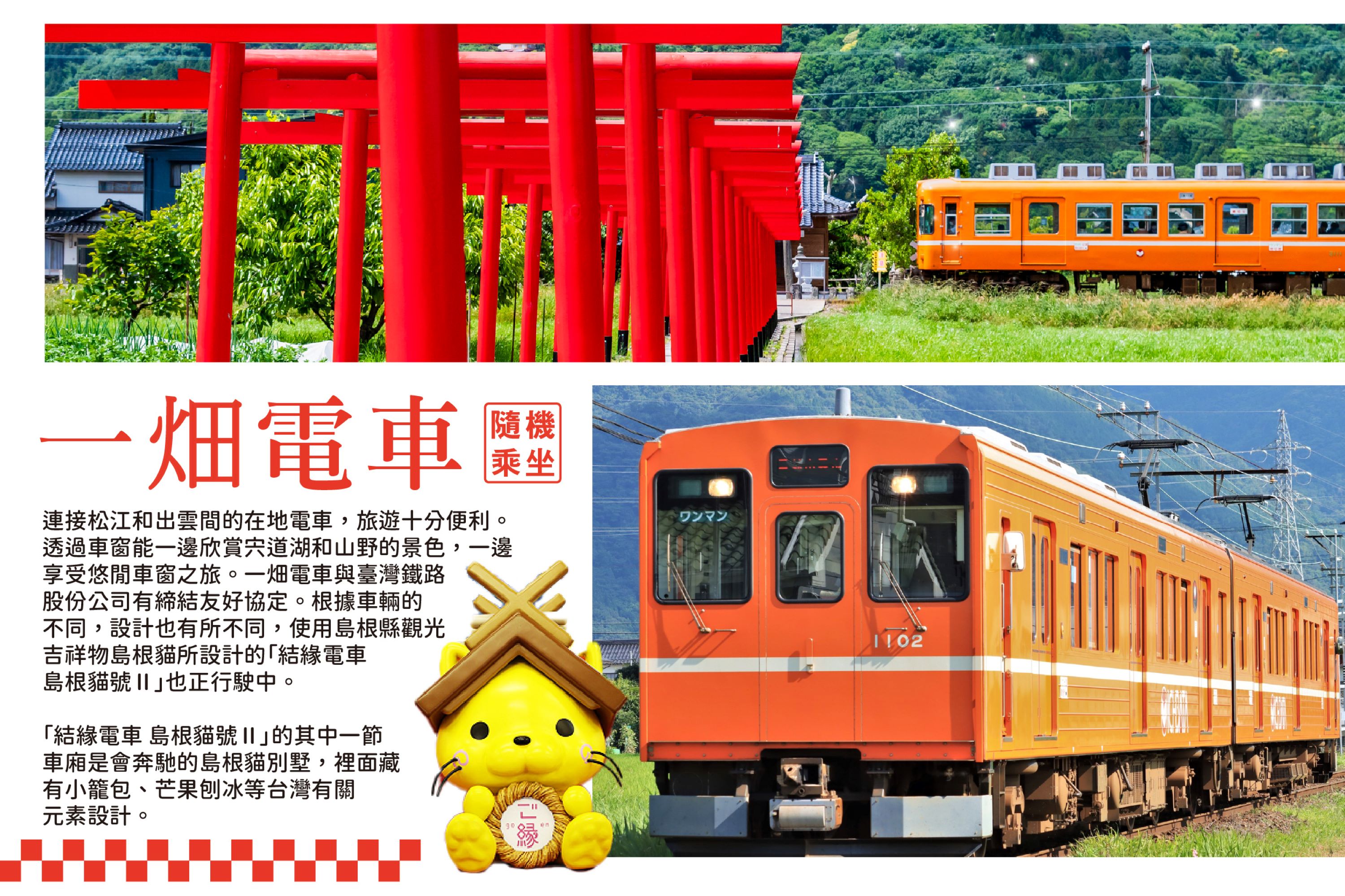【一畑電車】連接松江和出雲間的在地電車,旅遊十分便利。透過車窗能一邊欣賞宍道湖和山野的景色,一邊享受悠閒車窗之旅。一畑電車與臺灣鐵路股份公司有締結友好協定。根據車輛的不同,設計也有所不同,使用島根縣觀光吉祥物島根貓所設計的「結緣電車 島根貓號Ⅱ」也正行駛中。 「結緣電車 島根貓號Ⅱ」的其中一節車廂是會奔馳的島根貓別墅,裡面藏有小籠包和芒果刨冰等台灣有關元素設計。
