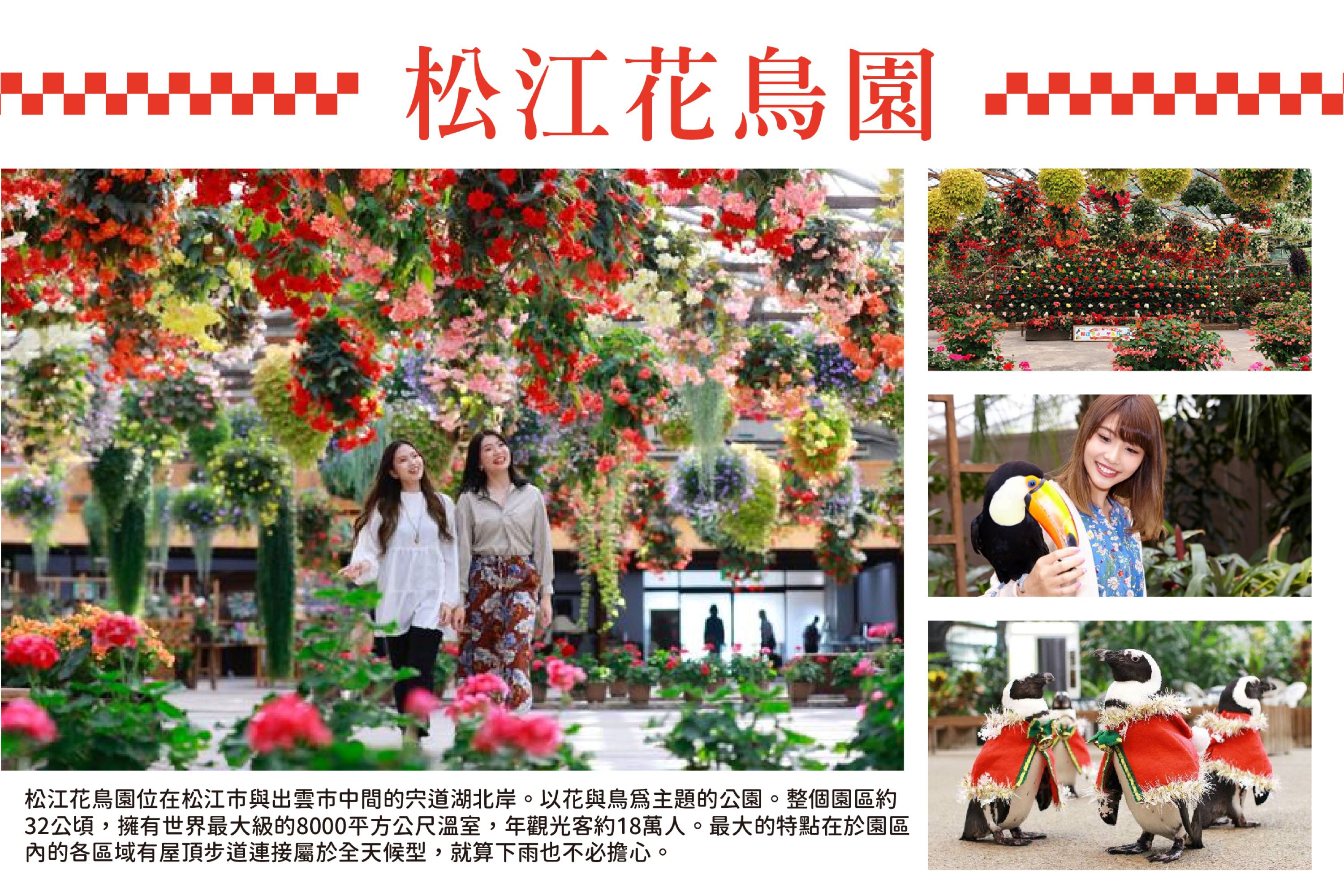 【松江花鳥園】松江花鳥園位在松江市與出雲市中間的宍道湖北岸。以花與鳥為主題的公園。整個園區約32公頃,擁有世界最大級的8000平方公尺溫室,年觀光客約18萬人。最大的特點在於園區內的各區域有屋頂步道連接屬於全天候型,就算下雨也不必擔心。園區內會依季節舉辦各種活動,並變更展示花卉,特別是貓頭鷹秀及企鵝散步秀吸引大量觀光客來園。