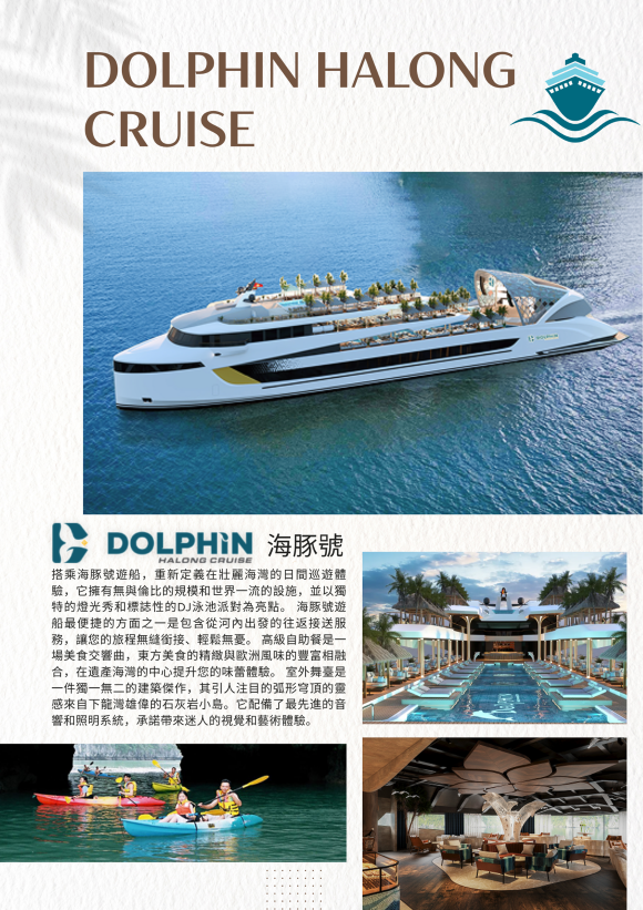 早晨起個大早將帶領貴賓前往碼頭搭乘【6星級月海豚號 Dolphin Cruise】出海遊覽世界文教組織列為【世界七大自然奇景之一】~《下龍灣》。其範圍非常廣泛面積約有一千五百平方公里,其上散佈有超過一千六百座石林、石筍狀的小島,由於大自然的鬼斧神工之妙,乘船繞行其中可以發現許多天然洞穴,在這些小島有許多天然洞穴中有鐘乳石奇景與古時隱士所遺留下來的漢文詩詞,這些島嶼岩洞為二億五千萬年前的石灰岩經嵱侵蝕而形成,在黑暗洞穴中,閃閃發亮的晶石,令您目不暇及,留連忘返。我們將帶您參觀下龍灣