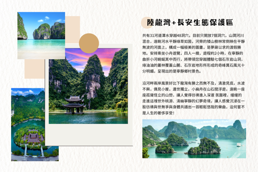 【陸龍灣】【長安生態保護區】共有31河道潭水穿越48洞穴,目前只開放7個洞穴,山澗河川混合,遠眺河水平靜綠草如茵,河旁的矮山樹林常倒映在平靜無波的河面上,構成一幅極美的圖畫,是夢寐以求的渡假勝地。安排乘坐小舟遊覽,四人一艘,遊程約2小時,在寧靜的曲折小河蜿蜒其中而行,將帶領您穿越體驗七個石灰岩山洞:地靈洞、黑洞、明洞、三靈洞、山羊洞、辰谷洞、龜后洞,每穿越一個洞穴會帶給您不一樣感受,綠油油的叢林覆蓋山麓、石灰岩地形所形成的奇峰異石風光十分明媚,呈現出的是寧靜鄉村景色。沿河畔兩岸風景好比下龍灣有勝之而無不及,清澈見底,水波不興,偶見小屋,遺世獨立,小扁舟在山石間浮遊,遠眺一座座孤聳怪立的山巒,讓人覺得彷彿進入深邃 氛圍裡,緩緩的走進這塊世外桃源、清幽寧靜的幻夢奇境,讓人感覺沉浸在一股彷彿與世無爭與身體共譜出一首輕鬆悠哉的樂曲,這何嘗不是人生的奢侈享受!