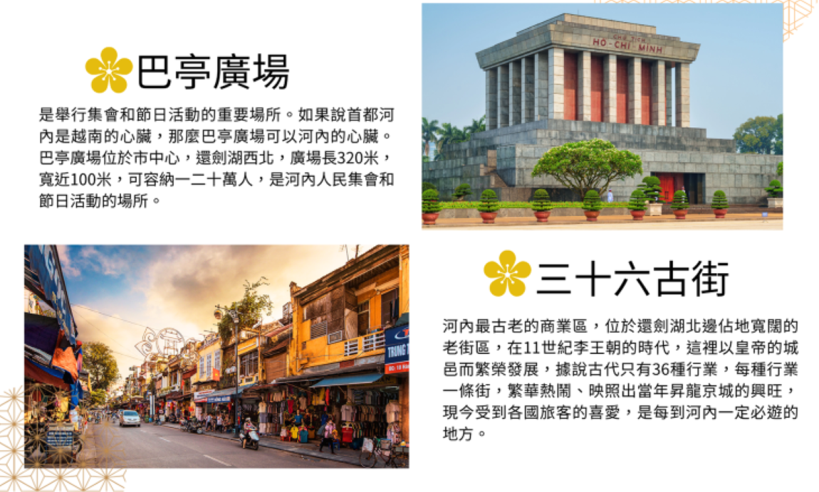 【巴亭廣場】位於河內市中心,1945年胡志明主席在此宣布越南民主共和國取得獨立,從此巴亭廣場成為越南的政治中心,廣場長320公尺、寬近100公尺,可容納一二十萬人,如今是越南國家重大節日舉行集會、慶典和閱兵的地方。