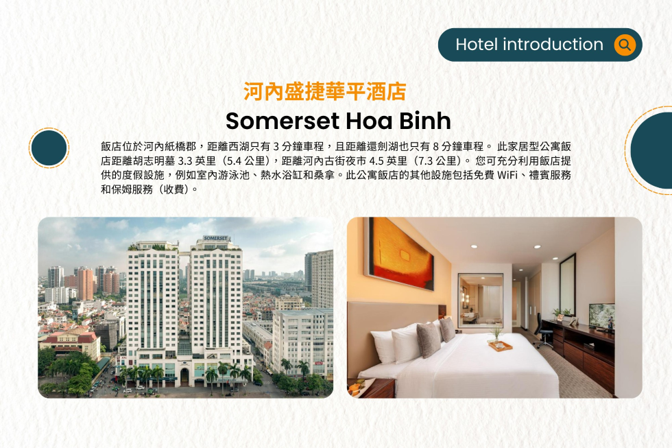 住宿:河內4星級 Somerset Hoa Binh Hotel 或 Grand View Hotel 或 Gloud Hotel 或同級