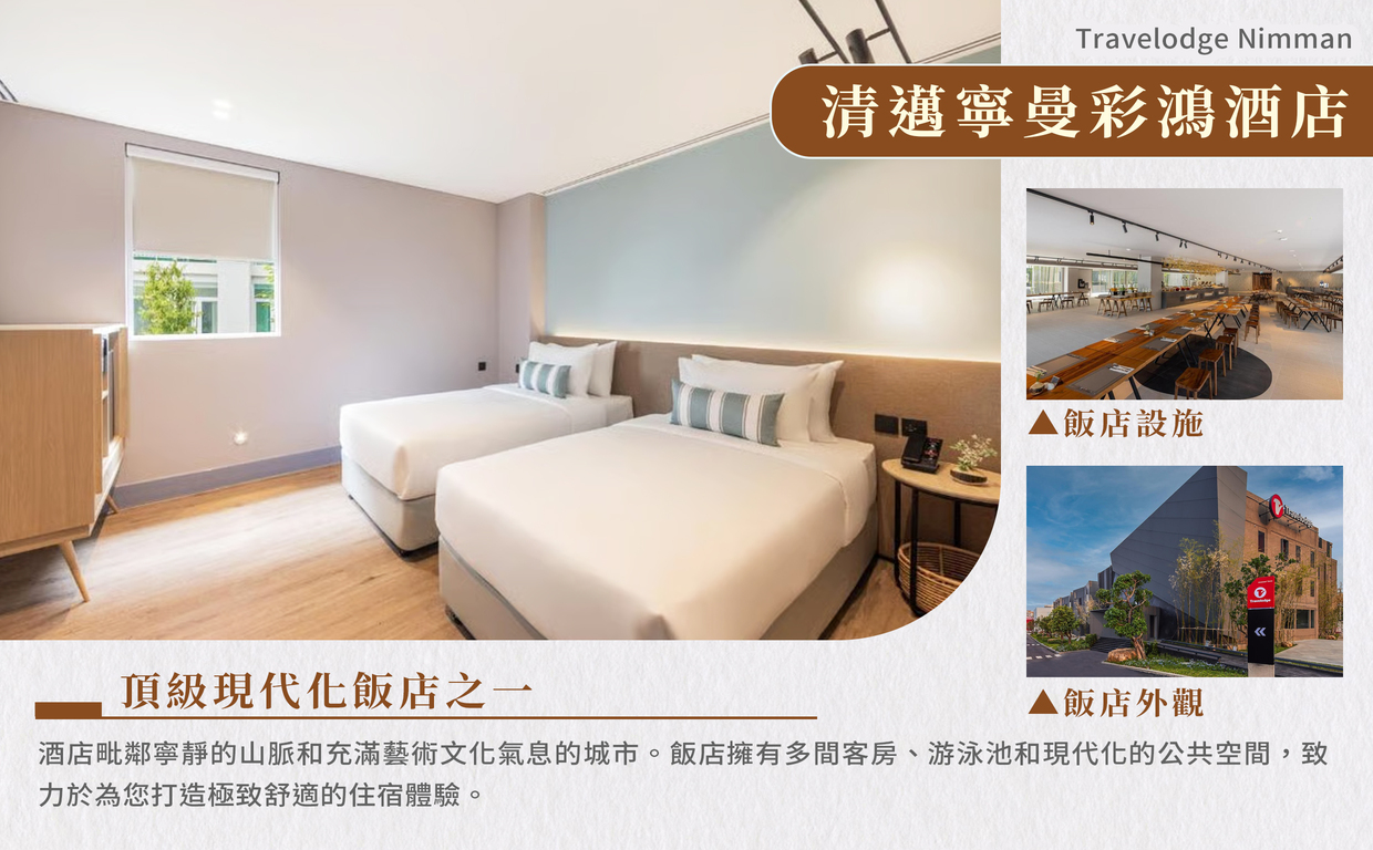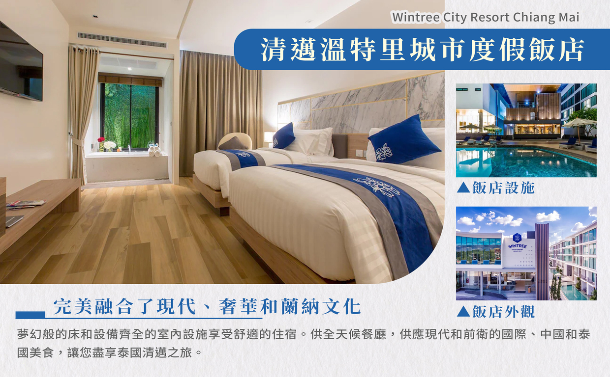 住宿:清邁WINTREE/或Travelodge/或MOVENPICK/或CENTARA/或NOVOTEL 或同等級