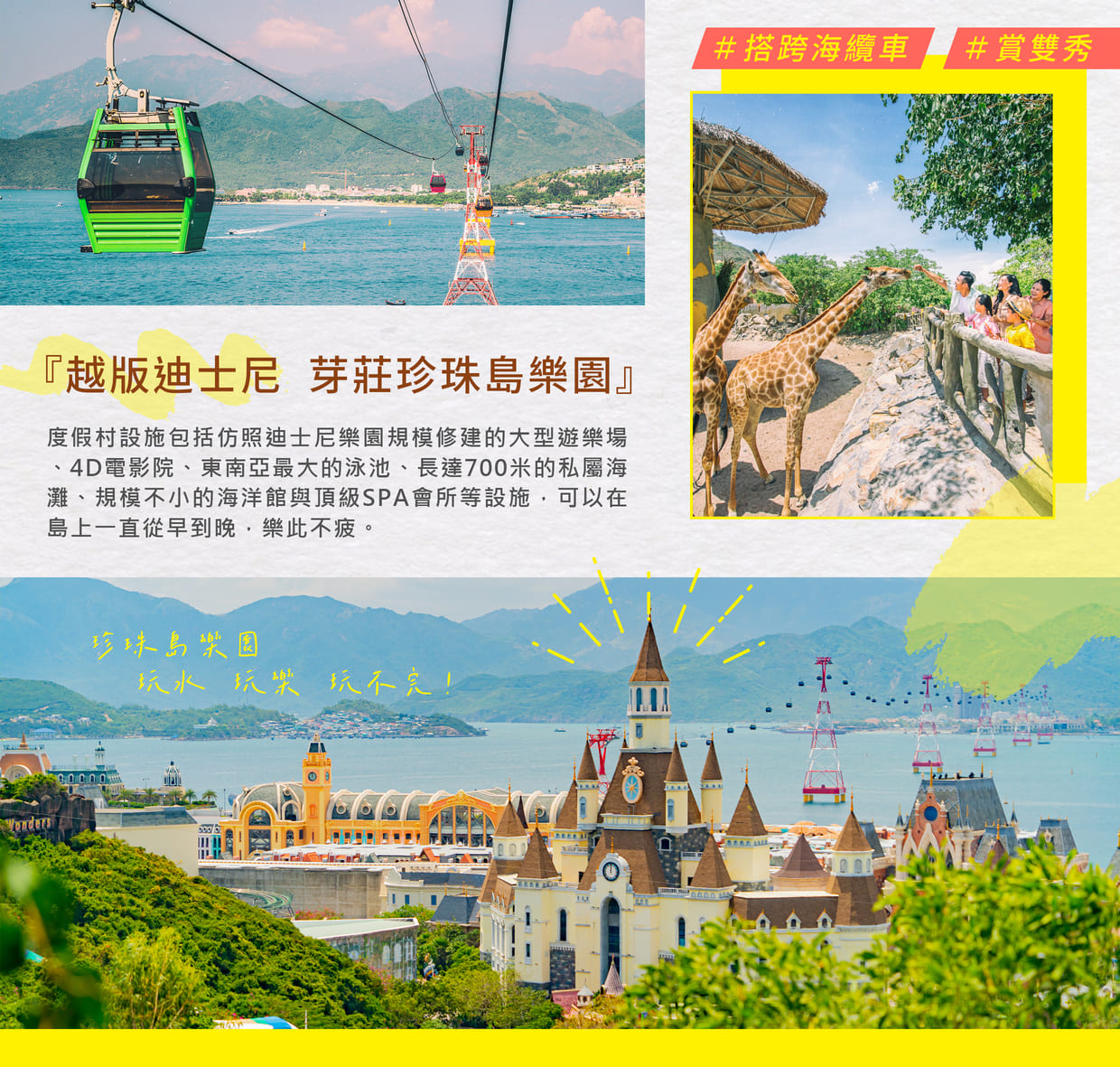 ◆珍珠島:珍珠島是越南遠近聞名的集住宿、餐飲、大型 遊樂設施等為一體的娛樂場所,Vin(寓意越南,Vietnam)和Pearl(意為珍珠)這兩個詞的結合體,是“越南海上的一顆明珠”的意思。是世界一流的豪華熱帶度假海島,也是小孩子和家庭遊的最愛!!!度假村設施包括仿照迪士尼樂園規模修建的大型遊樂場、4D電影院、東南亞最大的泳池、長達 700米的私屬海灘、 規模不小的海洋館與頂級 SPA 會所等設施,可以在島上一直從早到晚,樂此不疲。